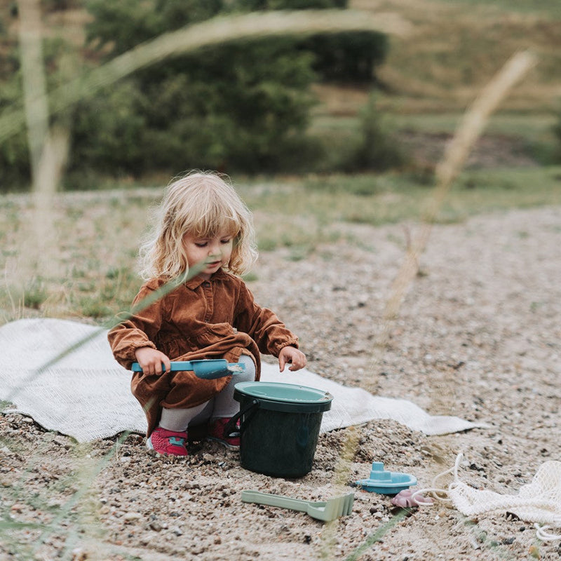 A lovely bucket set that includes a strainer, boat and shovel. The set provides many opportunities for sensory play and exploring sand and water in the great outdoors. The Bucket Set from Blue Marine Toys, like all other toys from the range, is made from recycled plastic derived from marine gear such as nets, trawls and ropes. At the factory in Hobro, these residual materials are transformed into toys, as using the recycled gear is a preventive action against fishing and marine gear ending in the oceans. The Blue Marine range encourages you to play with sand and water in the great outdoors - in the very nature that we must care for and protect. With Blue Marine Toys, Dantoy is making a sustainable, preventative move towards protecting nature. The range is created and inspired from the marine world, in the process of creating Blue Marine toys. From the collection of used gear to sort, transform and recycle. The set includes 6 pieces in lovely Blue Marine colours, which may vary slightly due to the material product.- Sustainable toys made from recycled fishing gear. - Made in Denmark. - Contains no harmful toxins. - Dishwasher safe. The Bucket Set from Dantoy's marine world, Blue Marine Toys, includes several elements that provide ample opportunity for sensory play and for exploring sand and water in the great outdoors.For ages 2 yrs+