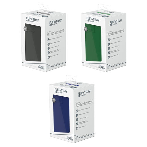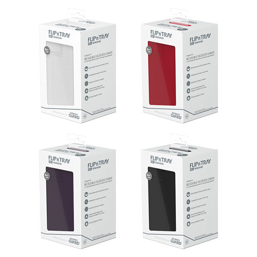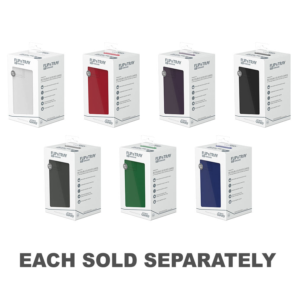 The quintessential Ultimate Guard deck box: a timeless monocolored design with strong magnetic closure, card and dice trays for safe storage of your deck, and a resistant but smooth Xenoskin surface. With room for 80 double-sleeved or 100 single-sleeved cards in standard size, the Flip'n'Tray 80+ has it all.