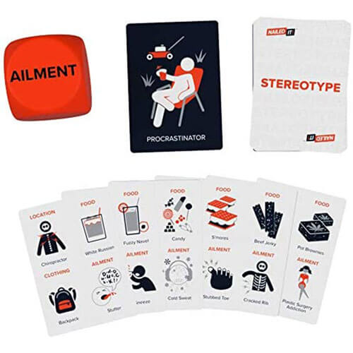 Nailed It est un jeu de société pour adultes où les joueurs peuvent célébrer les stéréotypes relatables que nous voyons dans notre vie quotidienne. Les joueurs recevront chacun 6 cartes de catégorie pour commencer la partie. Sur chaque carte, il y a des éléments de 4 catégories : emplacement, nourriture, vêtements et maladie.