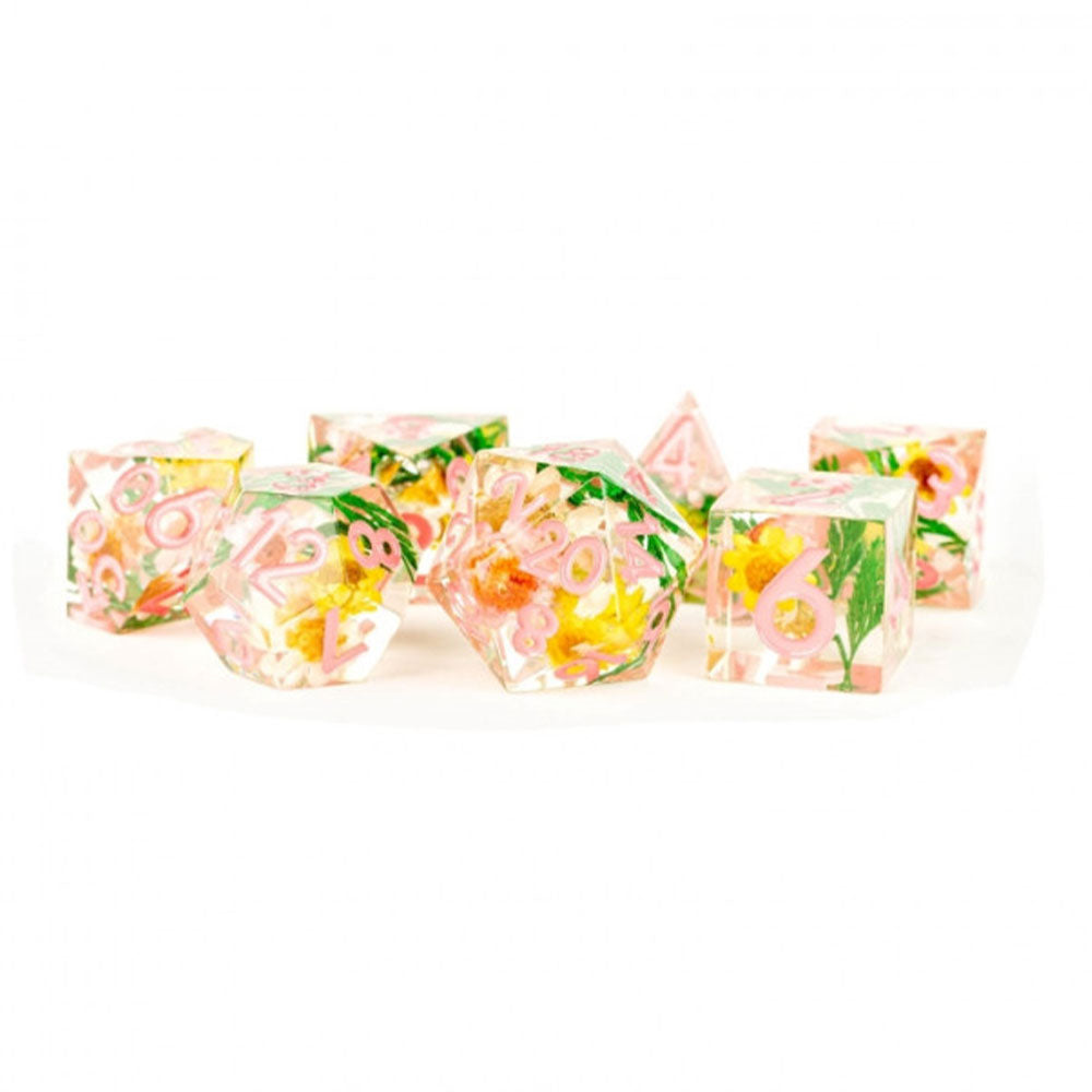 Nos dés en résine à bord artisanal et tranchants sont polis à la main pour garder leurs beaux bords tranchants. Ces dés sont infusés de belles fleurs réelles. Parce que ces dés ne sont pas tombés, ils sont plus précis que les dés plastiques produits en masse. Il est difficile de battre la valeur de nos ensembles de dés de résine. Beau et abordable, ce sont d'excellents "renforts critiques" à nos dés métalliques. Chaque ensemble polyédrique de 16 mm est livré avec 7 dés (D4, D6, D8, D10, D10 (00-90), D12 et D20).