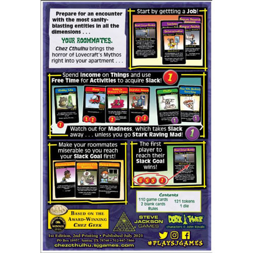 • Chez Cthulhu comprend tout ce dont vous avez besoin pour jouer, dès la sortie de la boîte : des cartes, des jetons pour Slack et Madness, et des dés.