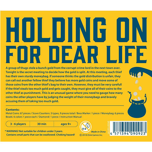 Moneybags, les joueurs essaient d'avoir le plus de pièces d'or, chaque joueur ayant son propre sac rempli d'un certain nombre de pièces en laiton. Si vous pensez que vous avez le plus de pièces, vous voudrez peut-être quitter le tour pour les garder car d'autres essaieront de transférer des pièces de votre sac vers le leur !