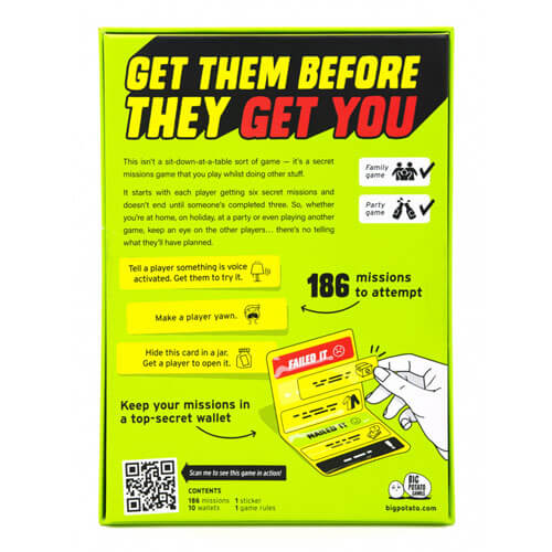 Sur chaque carte se trouve une mission - une mission qui vous oblige à tromper l'un des autres joueurs d'une manière ou d'une autre. Par exemple : « Cachez cette carte dans un bocal et demandez à un joueur de l'ouvrir ». Si un joueur se sent suspect et vous accuse, vous devez dire la vérité et retirer cette mission de votre portefeuille.